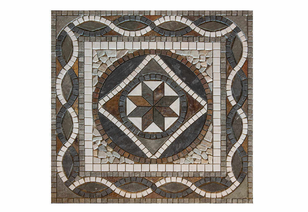 Mozaicul Design are o dimensiune de 100x100cm si este compus din diferite tipuri de ardezie si marmura alba de Thassos. Finisajul natural il face pretabil mai ales spatiilor exterioare, putand accetua sau delimita anumite zone de interes, dar poate fi folosit cu succes si in spatii interioare cu design clasic, rustic sau mediteranean. Prezinta tonuri de alb, gri si maron, astfel putand fi inserat cu usurinta in spatiul destinat, fara a obliga o anumita cromatica. Prin modelul medalionului, poate deveni piesa centrala intr-un pavaj monoton.