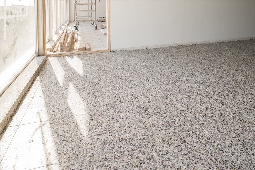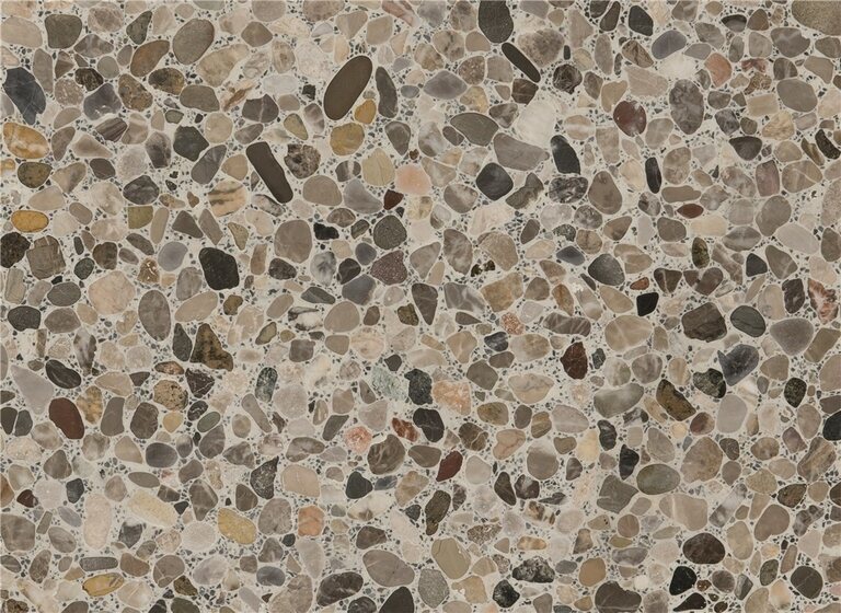 Pebbles Beige are un ton general beige, strapuns de granule de marmura in nuante diferite de maron, gri si caramiziu ceea ce il face usor de introdus in orice tip de spatiu, fie exterior, fie interior, atat clasic cat si contemporan. Versatilitatea acestuia este greu de egalat de alte tipuri de materiale asemanatoare.